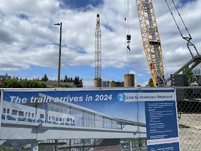 A segment of the Redmond Central Connecter Trail runs from Overlake Urgent Care to Redmond Town Center. Some of the light rail track will be installed on this segment. The controversial ERRATIC outdoor art was installed at this corner and then moved at great expense to a more suitable Leary Way location. |