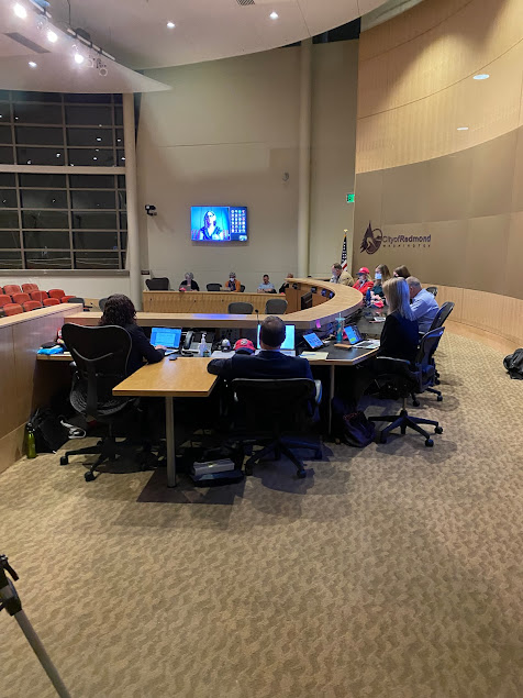 A good (though distant, fuzzy) view of senior staff from l-r is COO Malisa Files, Carol Helland, Director of Planning and Community Development. Chip Corder, Director of Finance. and Fire Chief Sheppard. In total, the Mayor has 11 Directors and 11 Deputy Directors. Angela Birney's come a long way since her days as a Parks Commissioner.